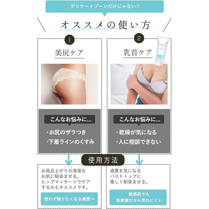 黒ずみの原因であるメラニンの生成を抑える効果が期待できる成分「水溶性プラセンタ」と、摩擦や乾燥などから肌を守る「グリチルリチン酸」を配合しており、デリケートな部分の黒ずみに徹底アプローチします。