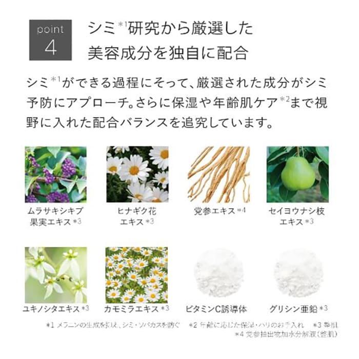 メラニンができる前に高い抗酸化作用を発揮し、メラニンの生成を抑制します。できてしまったシミやそばかすに対しても、復元作用で対応し、濁りのない白肌を目指すことができます。