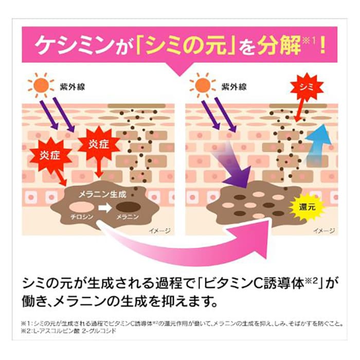 ビタミンC誘導体は、シミやくすみの原因となるメラニンの生成を抑制します。