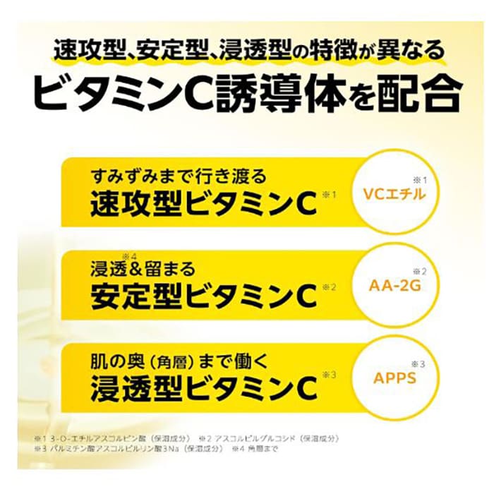 3-O-エチルアスコルビン酸、アスコルビルグルコシド、パルミチン酸アスコルビルリン酸、グリセリン、ツボクサエキス、グリチルリチン酸2K