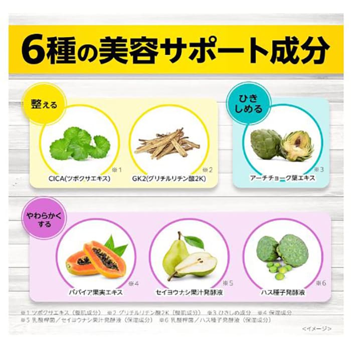 グリセリン、DPG、3-O-エチルアスコルビン酸、テトラヘキシルデカン酸アスコルビル、ヒアルロン酸Na、加水分解コラーゲン、豆乳発酵液、グリチルリチン酸2K