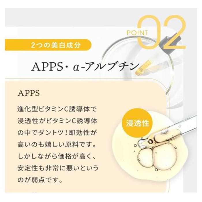 パルミチン酸アスコルビルリン酸3Na、アスコルビン酸グリセリル、α-アルブチン、グリセリン、加水分解コラーゲン、ヒアルロン酸Na、ツボクサエキス