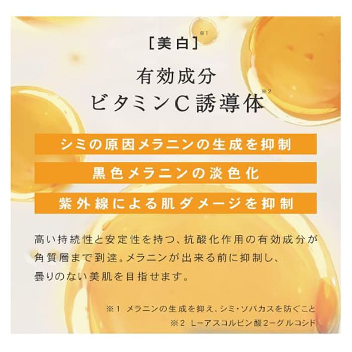 美白有効成分の高浸透ビタミンC誘導体が角質層の奥深くまでぐんぐん浸透し、メラニンの生成を抑え、シミ・そばかすを防ぎ、透明感のある肌へと導きます。