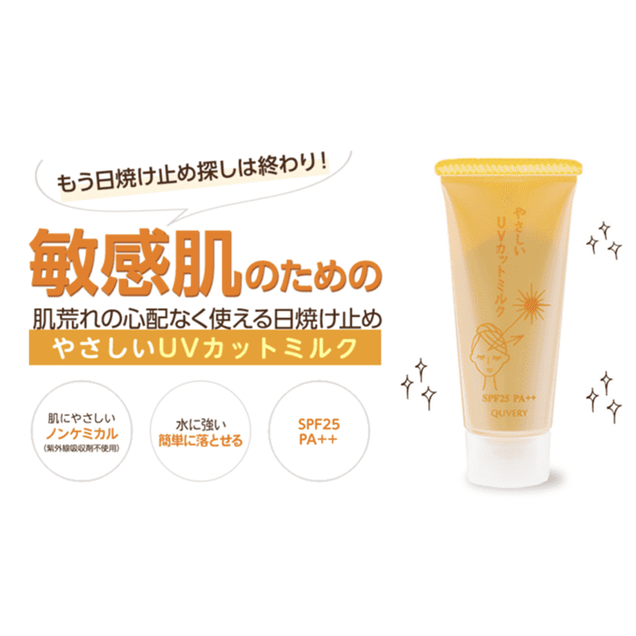 キュベリィ やさしいUVカットミルクは、敏感肌の方でも使いやすいノンケミカル処方(紫外線吸収剤不使用)の日焼け止めミルクです。