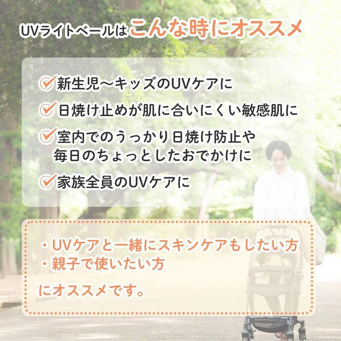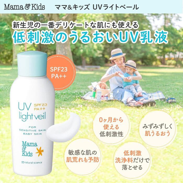 ママ&キッズ UVライトベールは、デリケートな新生児のお肌にも使える低刺激のUV乳液です。