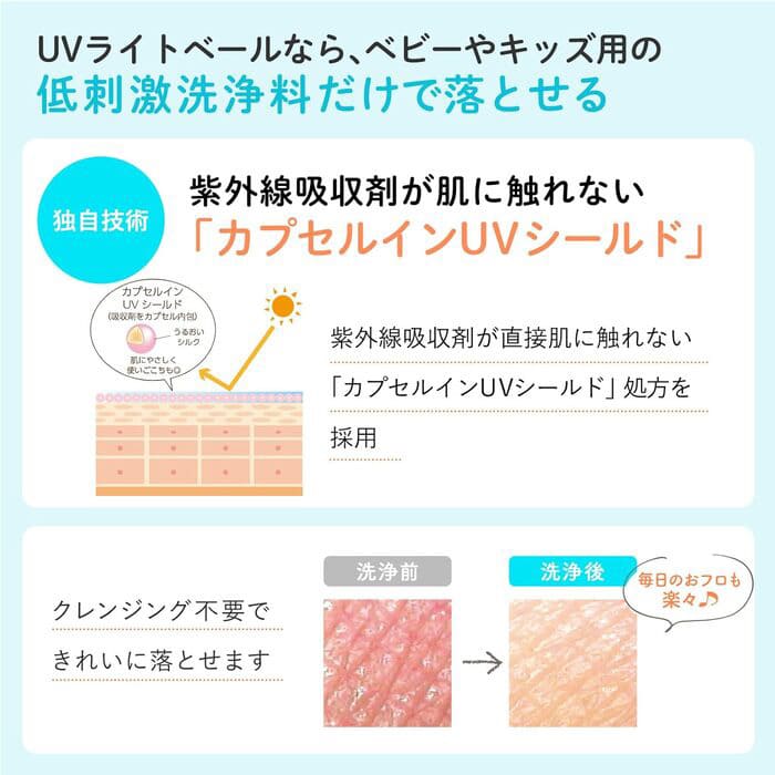 特許技術である「カプセルインUVシールド」によって、紫外線カット成分をカプセルに内包し直接肌に触れない仕組みになっているため、赤ちゃんのお肌にもやさしい使い心地となっています。