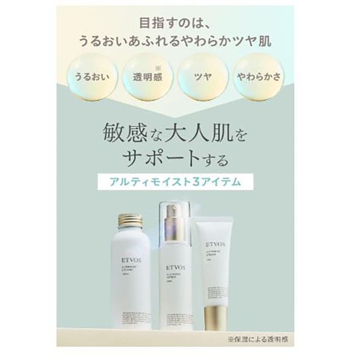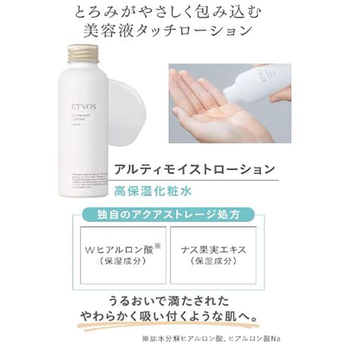 ETVOS アルティモイストローションは、使うたびに角層の水分量を底上げして、うるおいで満たされたやわらかく吸い付くような肌へと導いてくれる敏感肌用化粧水です。うるおいを角層全体に蓄えるために、厳選した4種類の保湿成分「ヒト型セラミド×Wヒアルロン酸×ナイアシンアミド×ナス果実エキス」を配合し、乾燥で固くなりがちな大人の肌をほぐすように穏やかに浸透します。敏感肌の方だけでなく、肌の水分量不足を感じている方や、肌のくすみが気になる方にもおすすめの商品です。