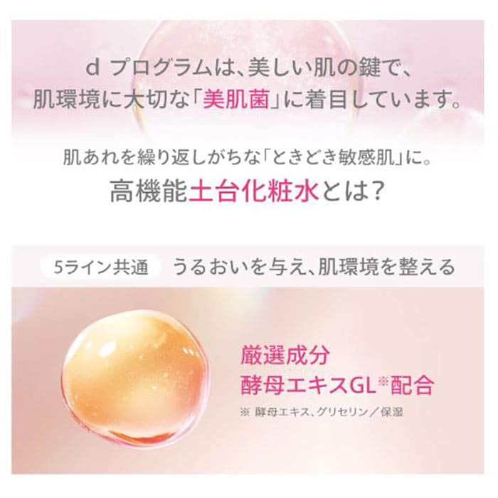 dプログラム モイストケア ローション MBは、誰の肌にも存在し、美しい肌の鍵である「美肌菌」に着目して作られた敏感肌用化粧水です。たっぷりのうるおいで、ごわついた肌をやわらかく整え、美容成分を角層深部まで浸透させます。