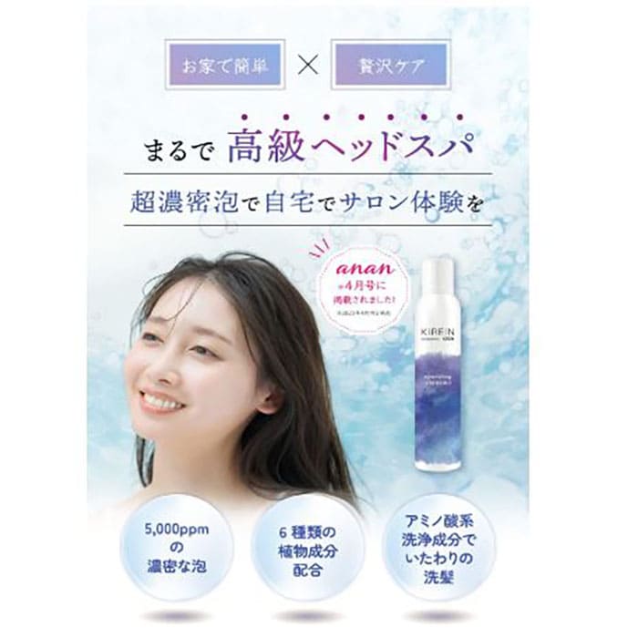 【KiREiN】炭酸シャンプーは、5000ppmが作り出すシルクのようななめらか泡が魅力の炭酸シャンプーです。高濃度の超濃密ミスト泡により毛穴の奥までスッキリ洗浄します。シルクのようななめらかさは、まるで高級ヘッドスパに通っているような感覚で毎日のお風呂時間を贅沢に彩るでしょう。アミノ酸系成分を使用しているので、肌が敏感な方も使いやすいです。