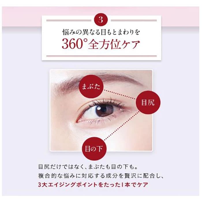 また、目尻だけでなく、まぶたや目の下も含めた目もと周り360°を隙なく対応するために、目元を明るい印象に整える保湿成分「真珠エキス」や、まぶたのしぼみやゆるみ、目の下のくすみなど複合的な悩みに対応する成分を贅沢に配合しています。大人女性がアイケアに求めるさまざまなニーズに包括的に応えてくれるので、1本持っておくだけでもかなり重宝します。