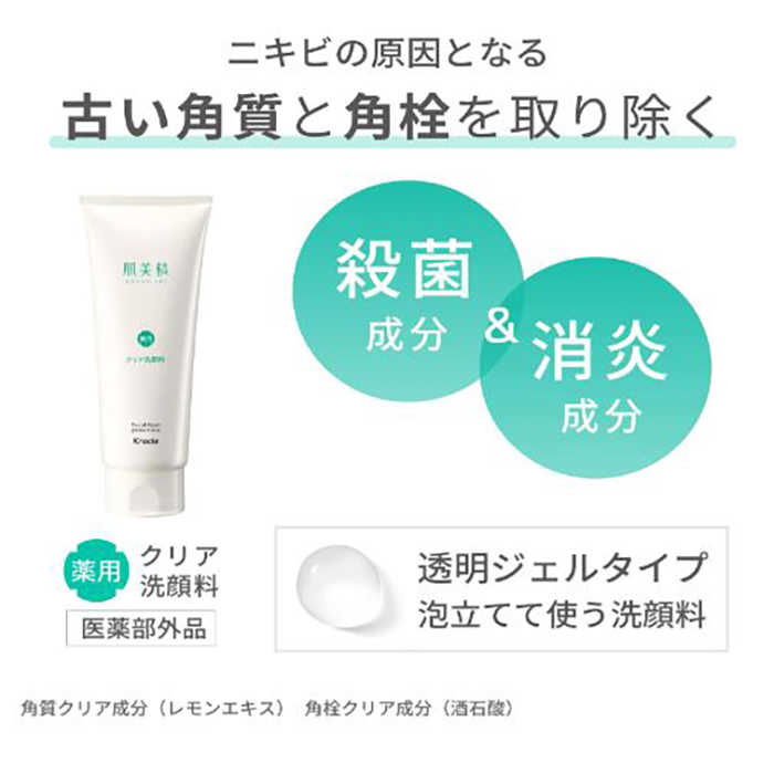 クラシエ【肌美精】大人のニキビ対策 薬用クリア洗顔料 (医薬部外品)は、ニキビの原因菌の殺菌をはじめ、増やさない・働かせないことでニキビを予防し、さらに黒ずみニキビ跡・凸凹ニキビ跡を保湿・整肌ケアで防ぐ、透明ジェルタイプの薬用洗顔料です。フルーツ酸でやさしく角質ケアもできるので、なめらかですこやかな肌を目指すこともできるでしょう。