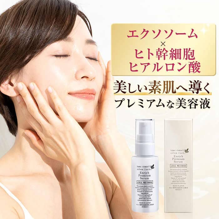 【Cell Method】 エンリッチプレミアムセラムは、ヒト幹細胞培養液と高濃度ヒアルロン酸を配合した独自のスキンケアメソッドで年齢肌にハリと潤いをもたらす美容液です。