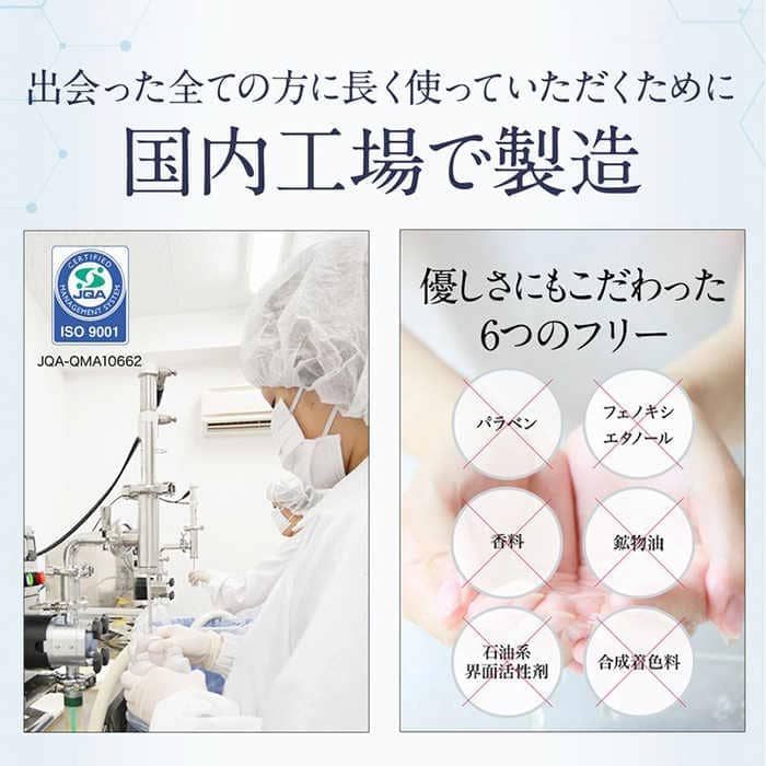 パラベン、鉱物油、シリコン、アルコール、合成着色料、合成香料、石油系界面活性剤、紫外線吸収剤無添加