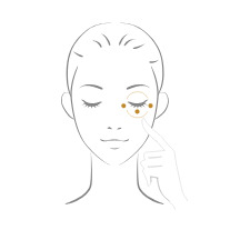 クリームを手にとり指先で数秒温めます。目の周り3点にクリームをのせ、目頭からこめかみに向けて引き上げるように塗りましょう。塗った後に指の腹でやさしく押さえることで、血流がよくなりむくみの解消にも繋がります。