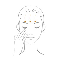 両眉の上・眉間の3点に置いて、ひたいを引き上げるように塗りこみましょう。