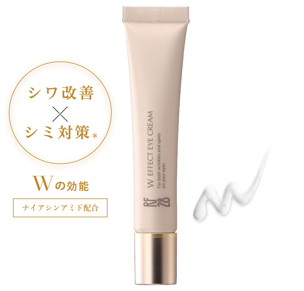 気になる目元の集中ケアができるRF28 Wエフェクト アイクリーム。有効成分であるナイアシンアミドを配合し、シワの改善とシミ対策・美白*のWの効果が認められています