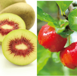 シミ*の予防をサポートする成分として、アセロラ・レインボーレッドキウイの2種類のフルーツエキスを配合