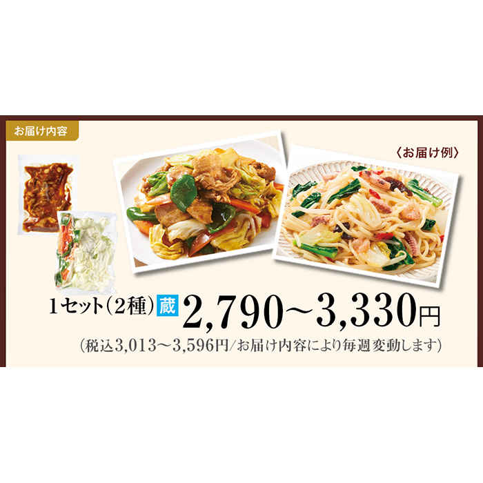 「私が仕上げる10分キット倶楽部」では、1週間に2種類ずつメインのおかずあるいは主食が届きます。