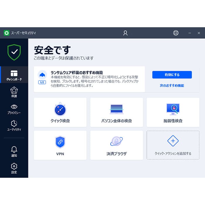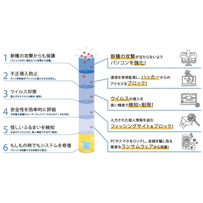 ウイルス対策だけでなく、マルウェアやランサムウェアおよび不正侵入からの保護をしてくれます。