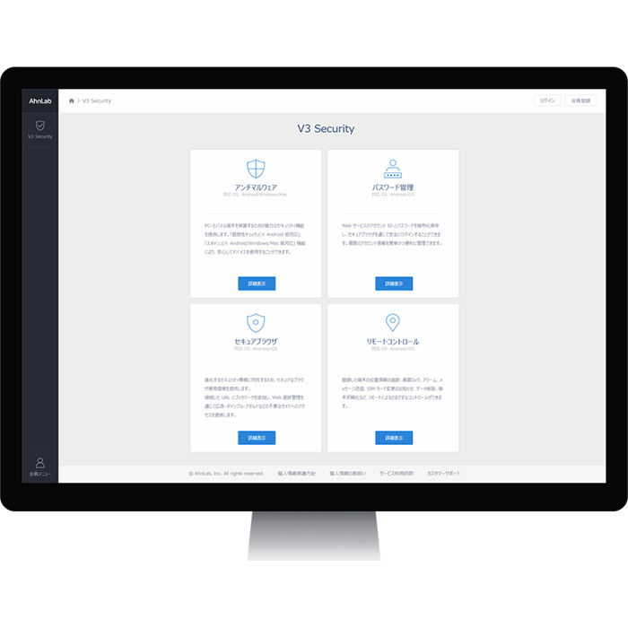 AhnLab V3セキュリティーは、マルウェアがPCに侵入する前に、検知して通知しブロックできます。有害サイトへのアクセスも遮断します。ファイル完全削除機能や暗号化保存するパスワード管理機能などで、個人情報の流出を防ぎます。