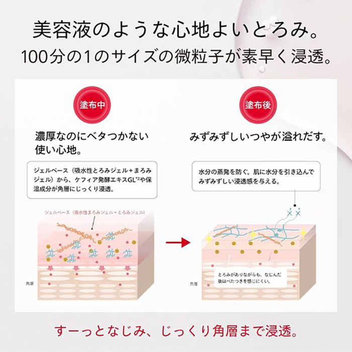 美容液のような濃厚なテクスチャーで100分の1サイズの微粒子が素早く角質に浸透し、使うたびに透明感あふれるうるおった肌へと導きます。