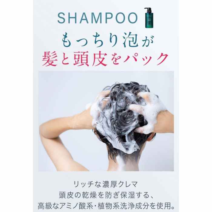 泡立ちにくいという特徴があるアミノ酸界面活性剤を60%も使用することで、濃厚な泡で髪や頭皮を洗うことができます。この濃厚な泡で髪の毛をパックするイメージで洗うことで、必要なうるおいを保ちながら、汚れをしっかりと落とすだけではなくシャンプーの有用成分が髪の毛に染み込みます。。奥ゆかしいグリーンシトラスの香りも1日の疲れを癒してくれることでしょう。