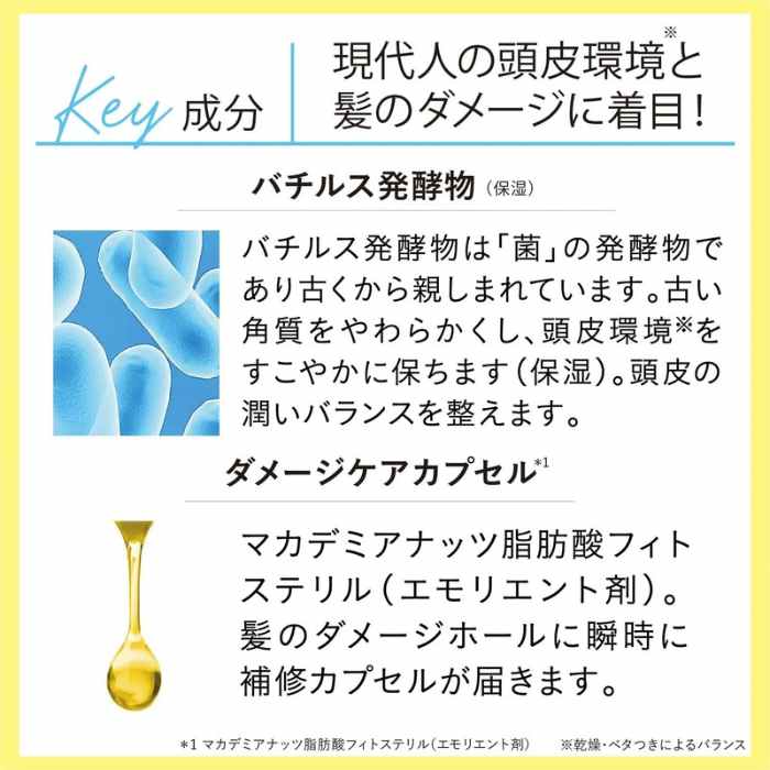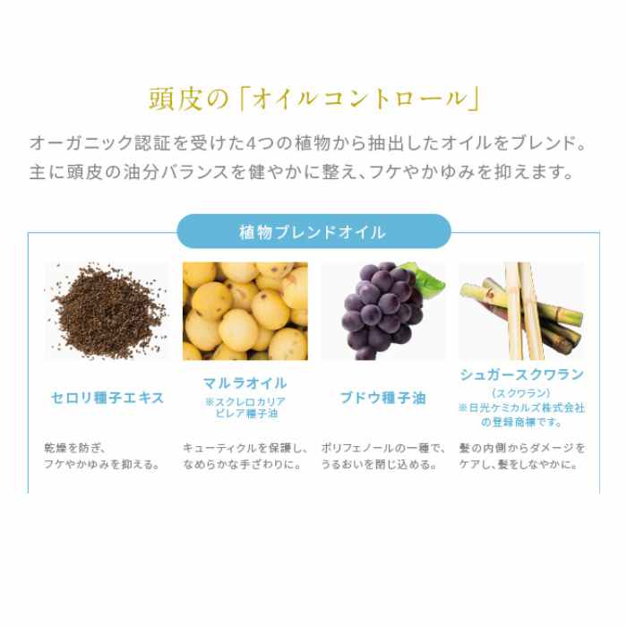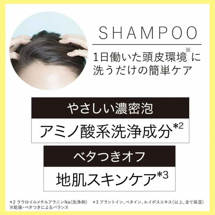 美しい髪に欠かせない頭皮ケアに注目し、古い角質を柔らかくする和らげるソープナッツエキスや、汚れをやさしく落とすヤシ由来の洗浄成分が配合されています。さらに、3種のアミノ酸が頭皮にうるおいを与えるため、乾燥が気になる人 方にも最適です。
