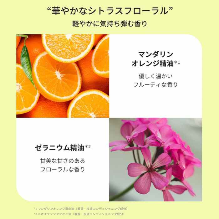 ノンシリコンでありながら指通りがよく、パラベンやパラフェンフリーといった、人にも環境にも配慮したフリー処方もポイントです。100%精油調合による華やかなシトラスフローラルの香りも心地よく感じていただけるでしょう。