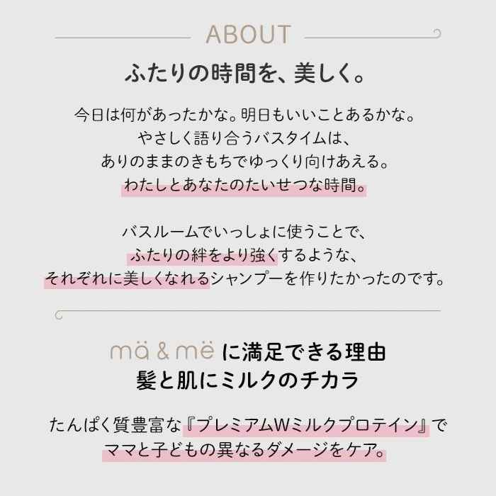 マーアンドミー ラッテシャンプーは、家族みんなで使える地肌にやさしいシャンプーです。たんぱく質豊富なミルクのチカラ「プレミアムWミルクプロテイン」が配合されているため、大人の髪をケアしながら、子どもの髪もやさしく守ります。
