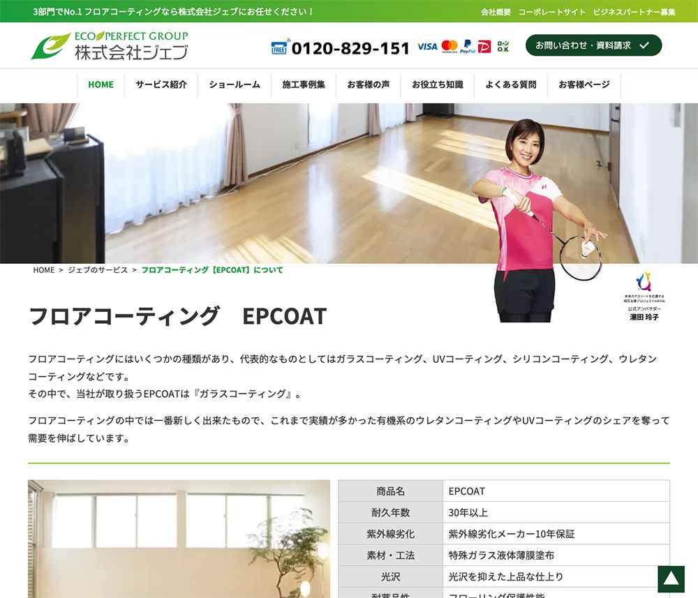 表面硬度の高いガラス系のフロアコーティング「EPCOAT」を主力にしています。表面の光沢を抑えた表面硬度9H以上の塗膜形成や、床暖房対応素材長期間耐久性などに強みを持っています。無料アフターメンテナンス契約も用意されています。