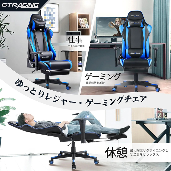 GTRACINGの「フットレスト シリーズ // GT002」は、快適性と機能性を追求したおすすめのゲーミングチェアです。高品質のPUレザーを使用し、通気性と耐久性に優れ、長時間の使用でも蒸れにくく、汚れも簡単に拭き取れます。