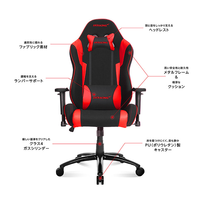 AKRacingの「Wolf ゲーミングチェア AKR-WOLF」は、エントリーモデルでありながら上位機種の基本設計と機能を継承した高コストパフォーマンスの製品です。表面素材には肌触りと通気性に優れたファブリックを採用し、長時間の使用でも快適な座り心地を提供します。