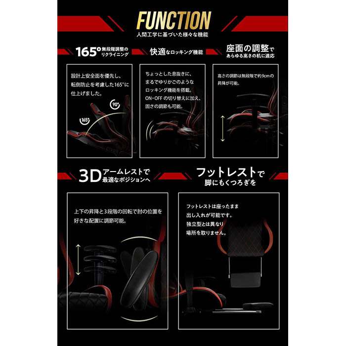 また、人間工学に基づいたデザインにより、背中や腰への負担を軽減し、最適なサポートを実現しています。さらに、リクライニング機能や高さ調節可能なアームレストなど、多彩な調整機能を備えており、ユーザーの好みに合わせたカスタマイズが可能です。
