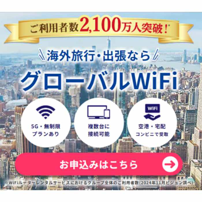 筆者は海外用のレンタルWiFiとして、「グローバル WiFi」をおすすめします。