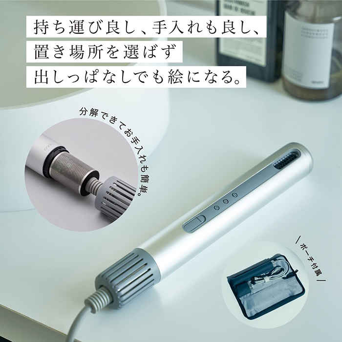 スティック型の形状が一番の特徴。スタイリッシュなデザインは、誰でも使いやすくヘアドライ時間に彩りを与えてくれます。