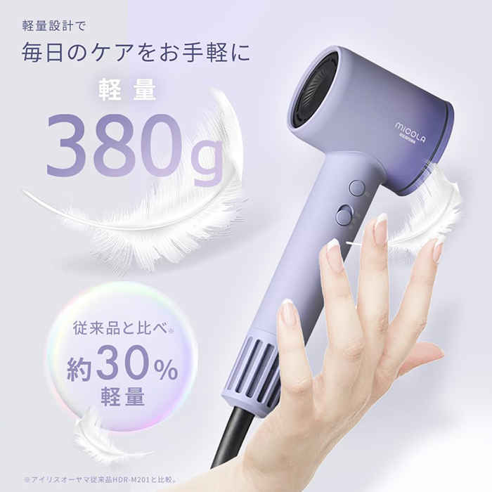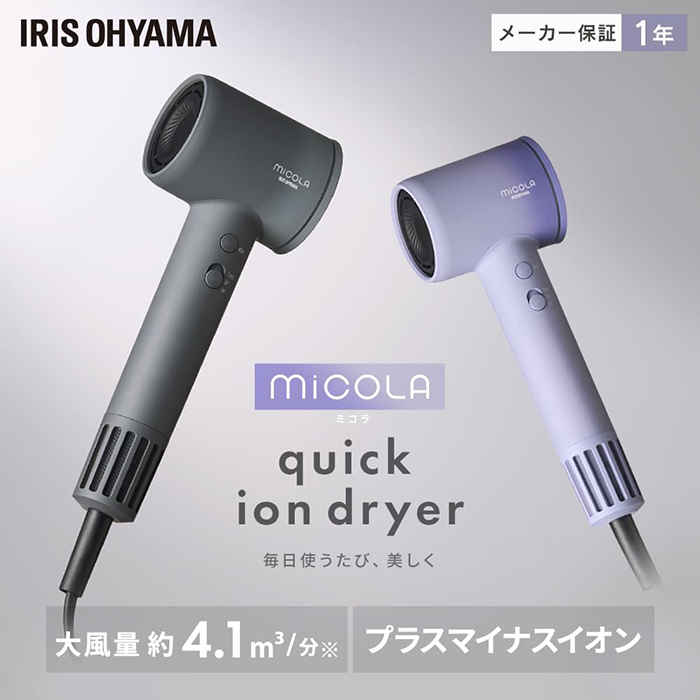 アイリスオーヤマのMiCOLA クイックイオンドライヤー 速乾モデルは、毎日のヘアケアを手軽にできるドライヤー。最大風量4.1㎥/分の速乾力で素早くヘアドライをすることができます。