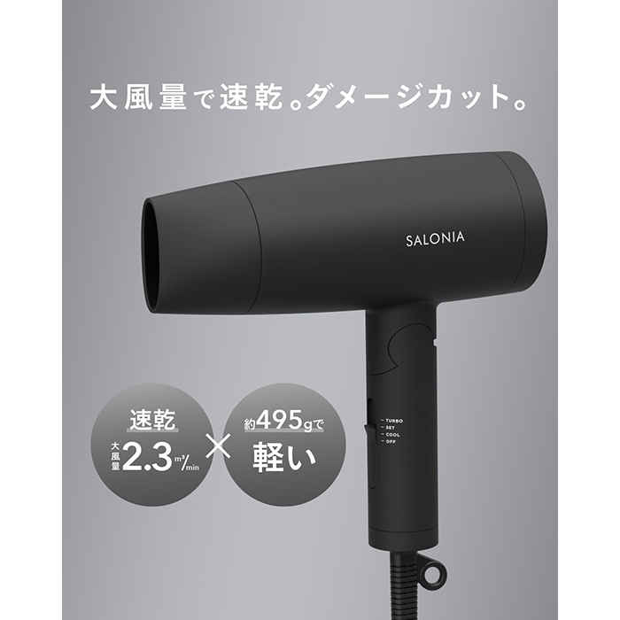 サロニアのスピーディーイオンドライヤーは、風量2.3㎥/分の大風量で速乾を実現したドライヤー。短時間ドライで髪へのダメージを最小限にし、やさしくヘアドライをしてくれます。シリーズ販売累計350万台を達成した人気の高い商品です。
