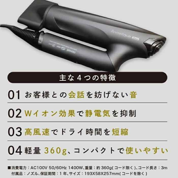 サロンでの使用を考えた4つの特徴がポイント。音・イオンバランス・ドライ時間のダメージ・コンパクトさに着目し、ドライヤーの常識を改善した商品です。