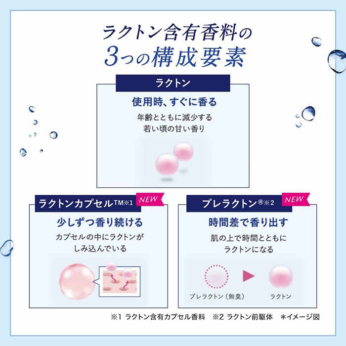 年を重ねるごとに変化する女性の香りに着目した商品。若い女性の香りに多い「ラクトン」を配合し、長時間香りが続く持続力も魅力です。