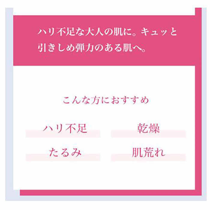 さらに、油剤と水溶性成分が形成する膜によって、ハリ感と艶が両立し、もっちり感のある艶やかでハリのある肌に導きます。大人の艶肌に必要な5元素「うるおい」「ハリ」「艶感」「輝き」「キメ」を同時にケアしてくれるため、乾燥する季節にこそ使ってほしい商品です。
