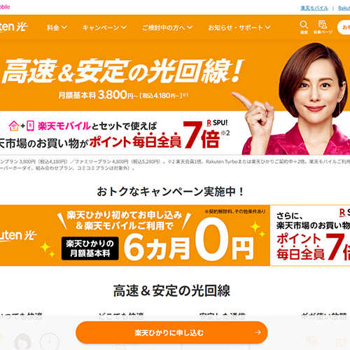 「楽天モバイル」とのセット契約が必須で、月額基本料6か月無料+工事費22,000円無料の特典が目玉。さらに「最強おうちプログラム」で楽天モバイルとの併用により毎月1,000ポイントが永年還元されます。