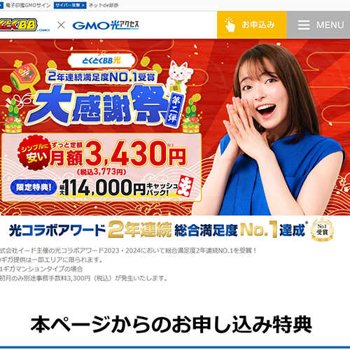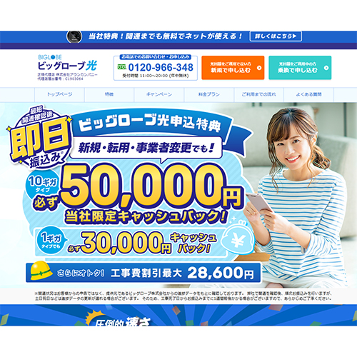 公式Web限定で最大66,000円(10ギガは最大70,000円)のキャッシュバックが魅力。さらに工事費28,600円が実質無料になる特典や、月額割引キャンペーンも併用可能です。
