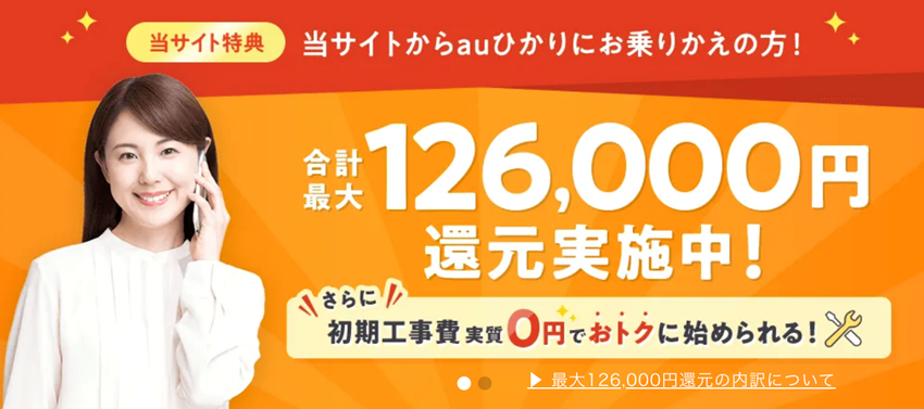 乗り換え時は公式の「乗りかえスタートサポート」で最大3万円が還元。さらにauスマートバリュー/自宅セット割加入で最大1万円が加算されます。初期費用は「初期費用相当額割引」でホーム最大41,250円/マンション最大33,000円が実質無料。