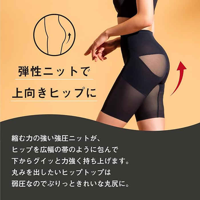 ヒップ・太もも・骨盤まわり・お腹・はみ肉にアプローチ。お肉の揺れやゆるみを防ぎ、ボディラインを持ち上げてくれます。締め付け過ぎず、芯が通ったような設計が特徴。体の形を整え、正しい理想的な姿勢に近づけます。