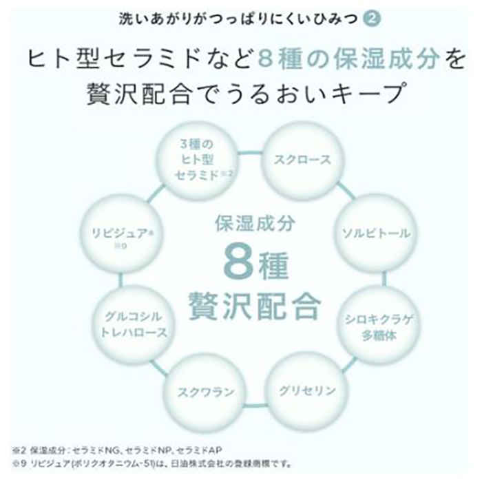 カリ含有石ケン素地、水、スクロース、グリセリン、ソルビトール、セラミドNG、セラミドNP、セラミドAP、フィトスフィンゴシン、グリコシルトレハロース、ポリクオタニウム-51、加水分解水添デンプン、シロキクラゲ多糖体、トレハロース、スクワラン、デシルグルコシド、ベヘニルアルコール、ステアロイルラクチレートNa、ペンタステアリン酸ポリグリセリル-10、エタノール、クエン酸Na