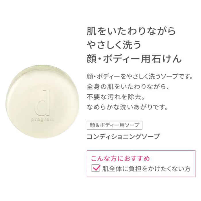 資生堂【dプログラム】コンディショニングソープは、肌をいたわりながらやさしく洗う、顔・ボディー用の石鹸洗顔料です。肌をいたわりながら不要な皮脂や汚れをやさしく取り去り、清潔で、すこやかな肌に整えます。洗浄後の肌にもかさつきやつっぱり感を与えません。ざらつきや毛穴の目立ち・ニキビも防いでくれるので、つるつるの肌を目指したい人やニキビができやすい人にもおすすめです。