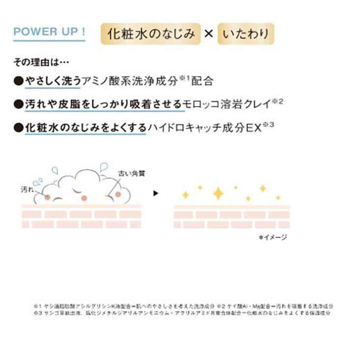 2つの成分の配合によって、肌本来のうるおいやバリア機能にもアプローチし、肌荒れを予防しながら、うるおいに満ちた美しい肌へと導きます。また、アミノ酸系洗浄成分とモロッコ溶岩クレイ配合の濃密泡で毛穴汚れや古い角質をやさしくオフしてくれるため、洗顔後の化粧水のなじみやすくなります。