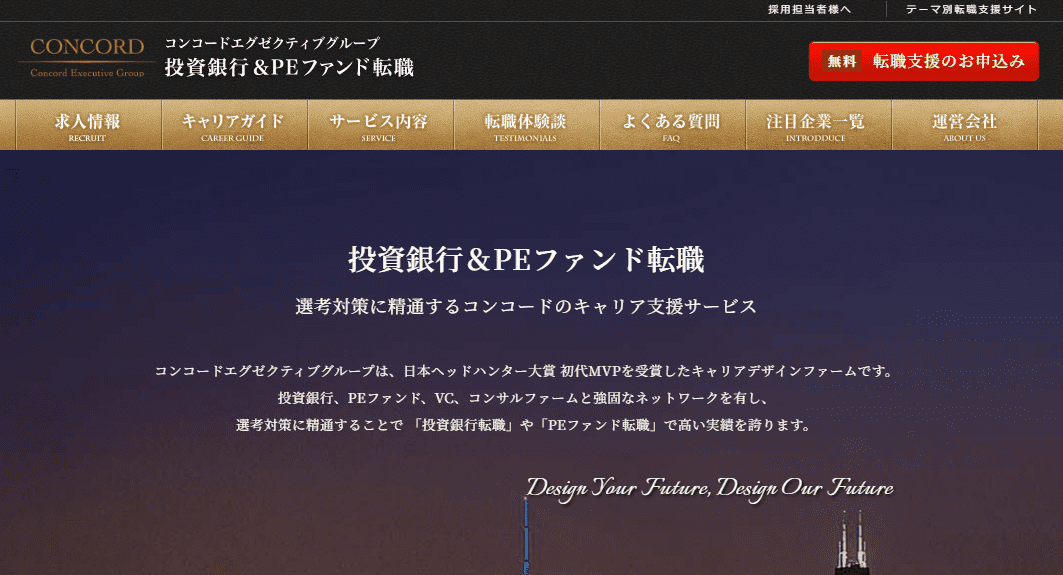 コンコードエグゼクティブグループは、投資銀行やPEファンドへの転職を目指す方に向けて、キャリア戦略の設計から内定獲得まで一貫した高品質な支援を提供するエージェントです。