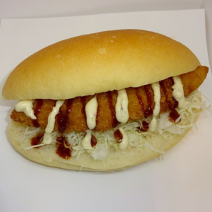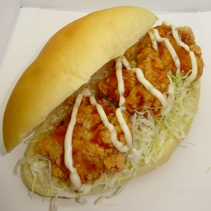コッペパンには千切りキャベツを敷き、その上に大ぶりの鶏ザンギを2つトッピング。マヨネーズが全体をまとめ、食欲をそそるボリューム満点の一品です。