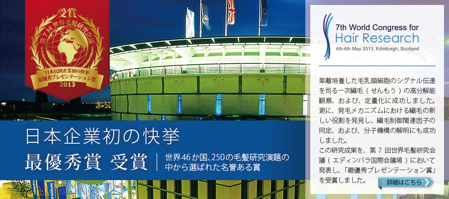研究では、この繊毛が伸長すると発毛促進シグナルが強化されることが確認されました。M-1研究チームは、「第7回世界毛髪研究会議」で、このマイクロセンサー理論を発表し、民間企業単独としては日本初となる最優秀賞を受賞しています。薬用 M-1 育毛ローションSは、この「マイクロセンサー理論」の研究に関わった開発チームが開発に携わっています。